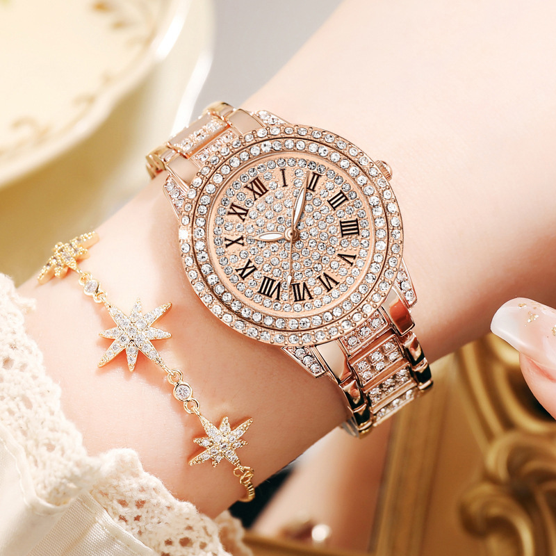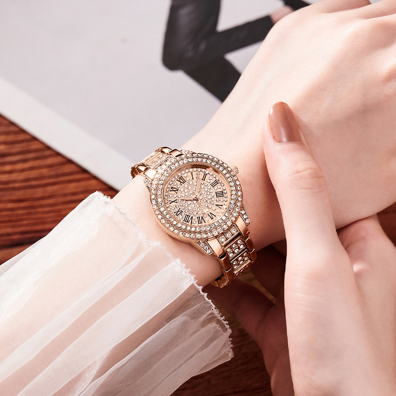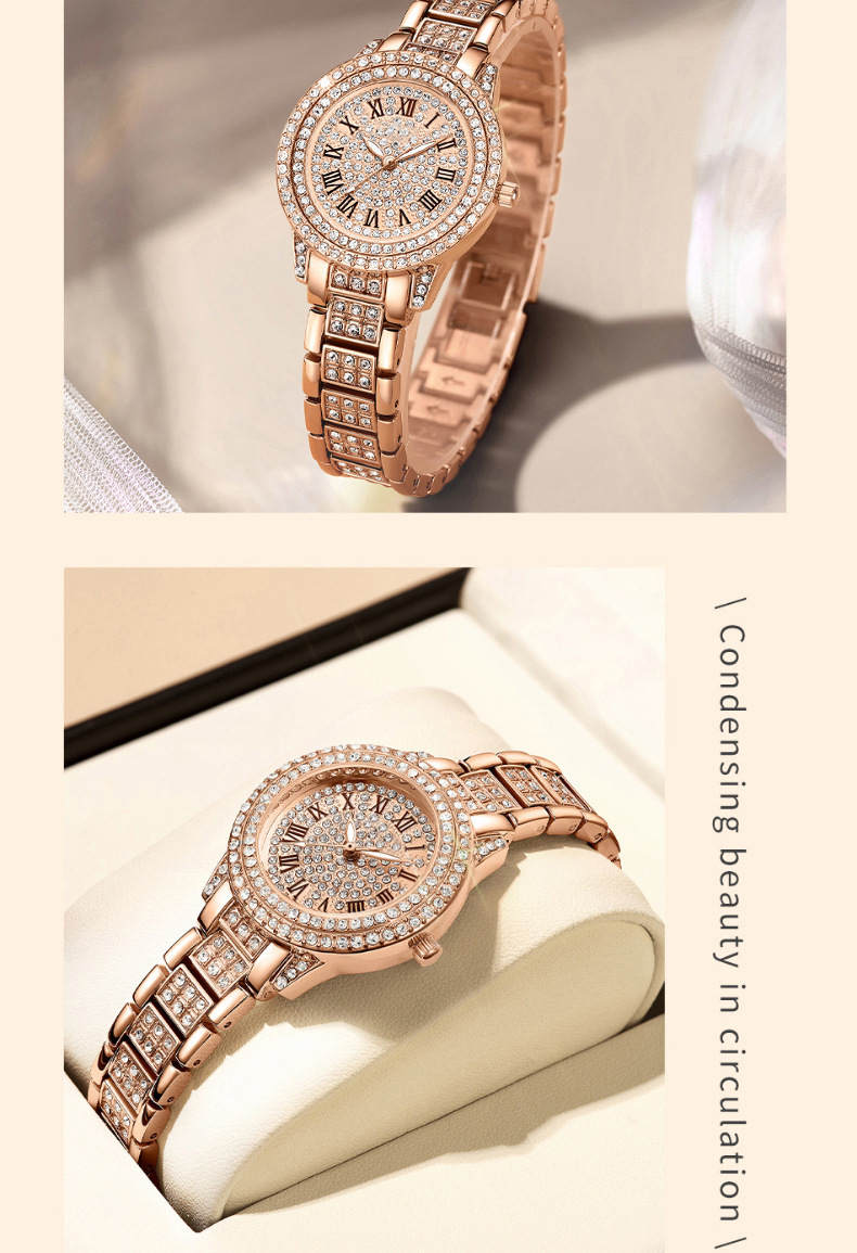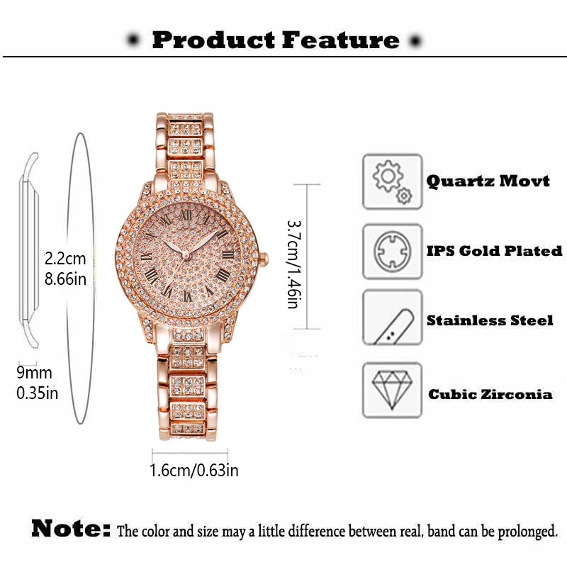 The full diamond Roman numeral steel watch radiates sophistication with its minimalist yet chic approach. With a surface diameter of 21mm and a case diameter of 32mm, it perfectly balances size and style. Its dial thickness of 10mm and strap width of 14mm ensure comfort and wearability for all-day use. The adjustable strap length of 230mm (including the case) allows for a customized fit, making it a versatile piece for any wrist. Weighing in at just 57g, it feels light yet luxurious on your skin.