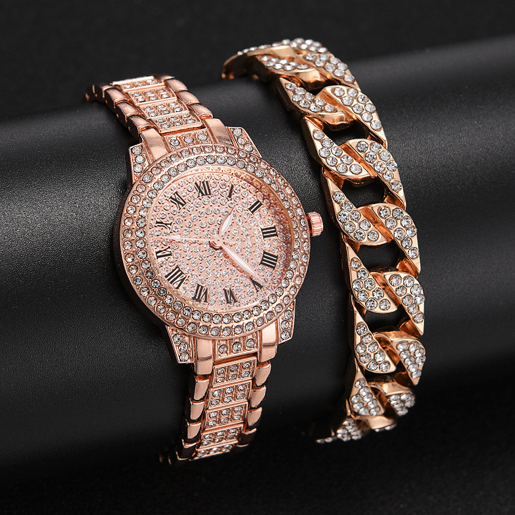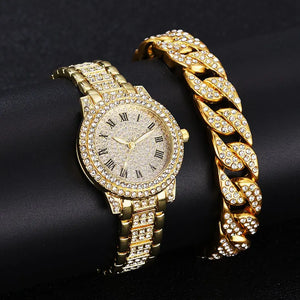Discover a stunning fusion of elegance and trend with our luxurious Roman numeral diamond-encrusted Cuban bracelet paired with a stylish women's watch. This exquisite set is designed for the modern woman who appreciates a bold statement in her accessories.
